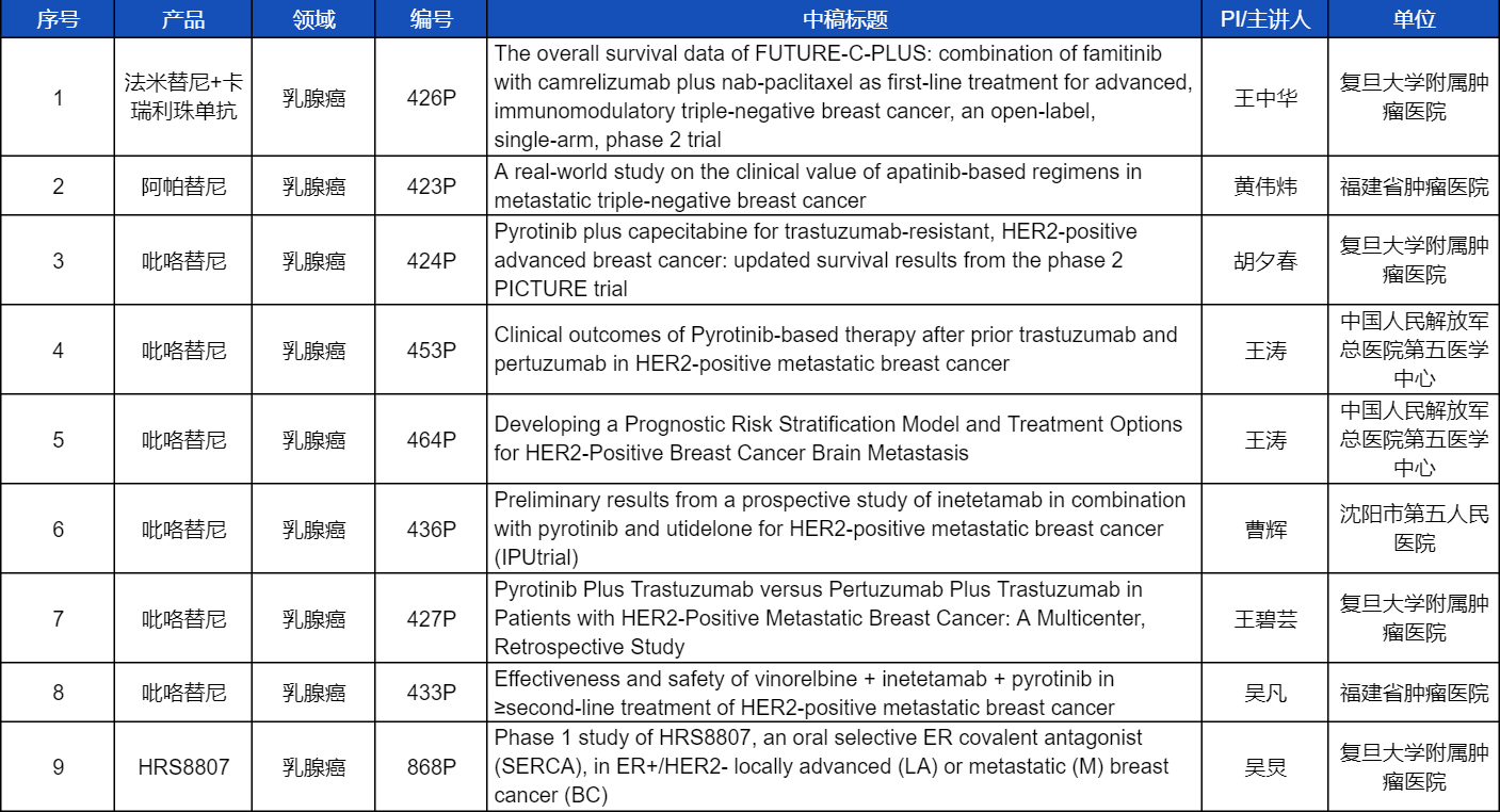 在乳腺癌领域,吡咯替尼、阿帕替尼、卡瑞利珠单抗、法米替尼,或产品间联合或联合化疗,共有9项研究入选壁报讨论,其中吡咯替尼占据6项,较为全面地展示了这款中国首个自主研发抗HER2靶向药在乳腺癌治疗中的显著特点和潜力。此外,DB真人医药自主研发的新型选择性雌激素受体共价拮抗剂(SERCA)HRS8807治疗ER+/HER2-局部晚期或转移性乳腺癌的Ⅰ期研究也成功入选,有望为此类患者带来更多用药新选择。