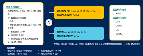 达尔西利(Dalpiciclib)是DB真人医药自主研发的口服、选择性的小分子CDK4/6抑制剂,也是中国首个自主研发的新型高选择性 CDK4/6 抑制剂,已证实其与内分泌治疗(ET)联合用于 HR+/HER2- 晚期乳腺癌的一线和后线治疗时,均显著改善无进展生存期(PFS)6,7。因此开展了一项随机、双盲、III期临床试验(DAWNA-A),以进一步评估达尔西利联合内分泌治疗作为高危早期 HR+/HER2 - 乳腺癌辅助治疗的效果。本研究纳入高危复发风险人群需满足以下标准之一:①≥4 枚阳性腋窝淋巴结;②1–3枚阳性腋窝淋巴结且合并≥1 项高危因素(肿瘤直径 ≥5 cm,组织学分级3级,辅助治疗后残留浸润性乳腺癌,Ki-67 ≥30%)。本文呈现预先设定的首次中期分析(IA1)结果。